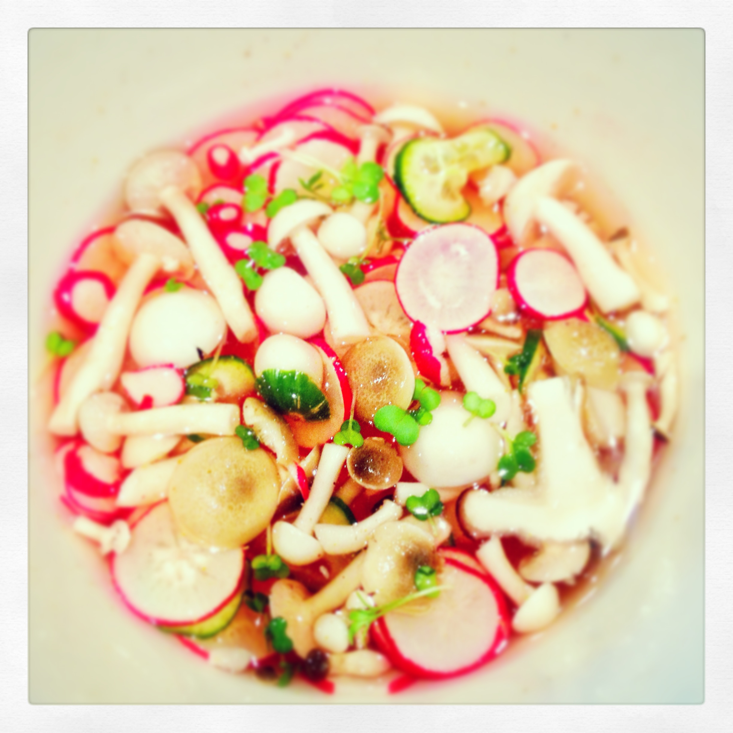 - If serving in the bowl as a side dish, just make sure everything can be seen. The white inner circles of the radish make great ‘frames’ for the cress and mushrooms. Try and fold the cucumber in nice waves throughout.