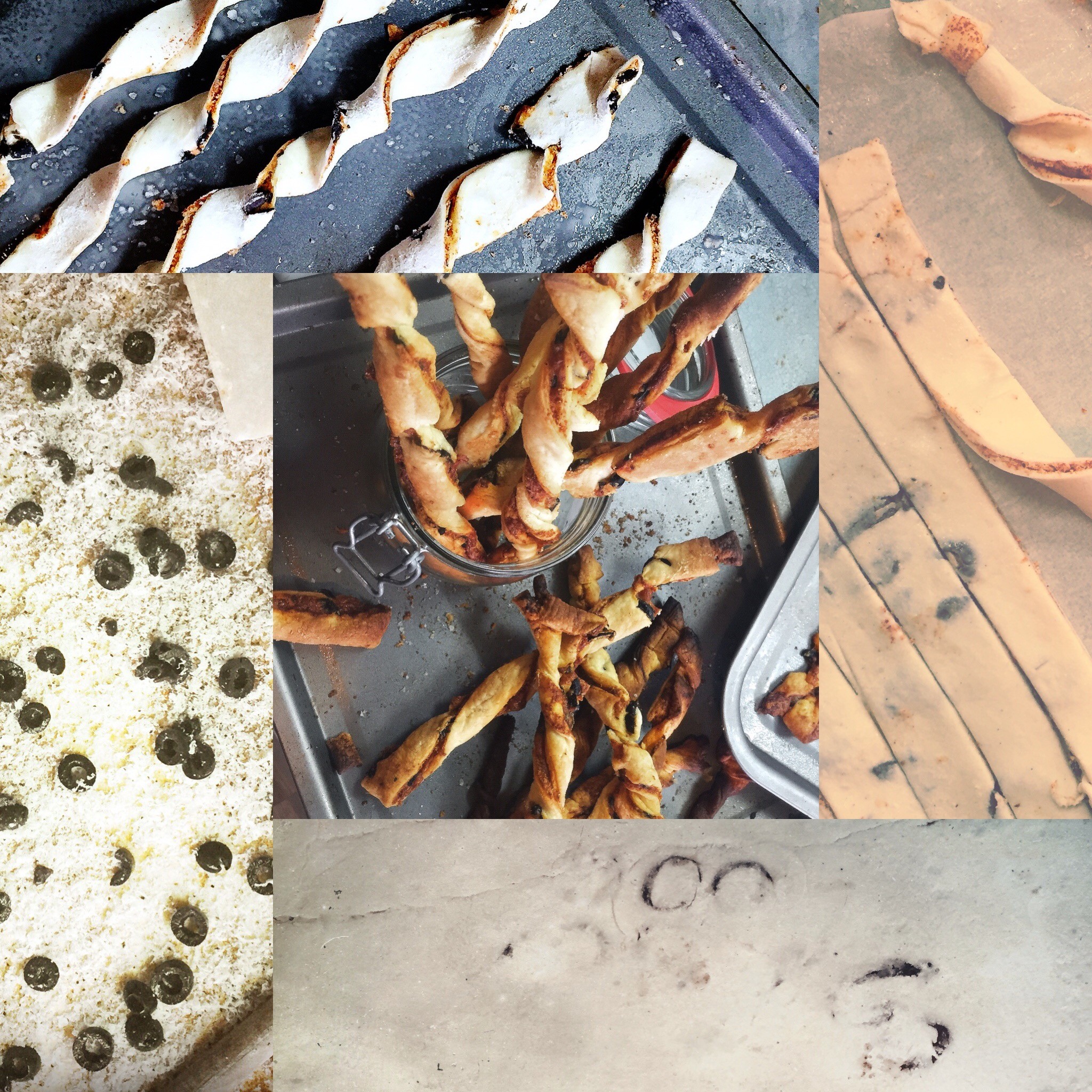 Cut into strips and roll up into twists by turning from opposite ends. Bake them on a tray in a 200c oven for about 20 minutes, or until golden. Leave to cool and serve.