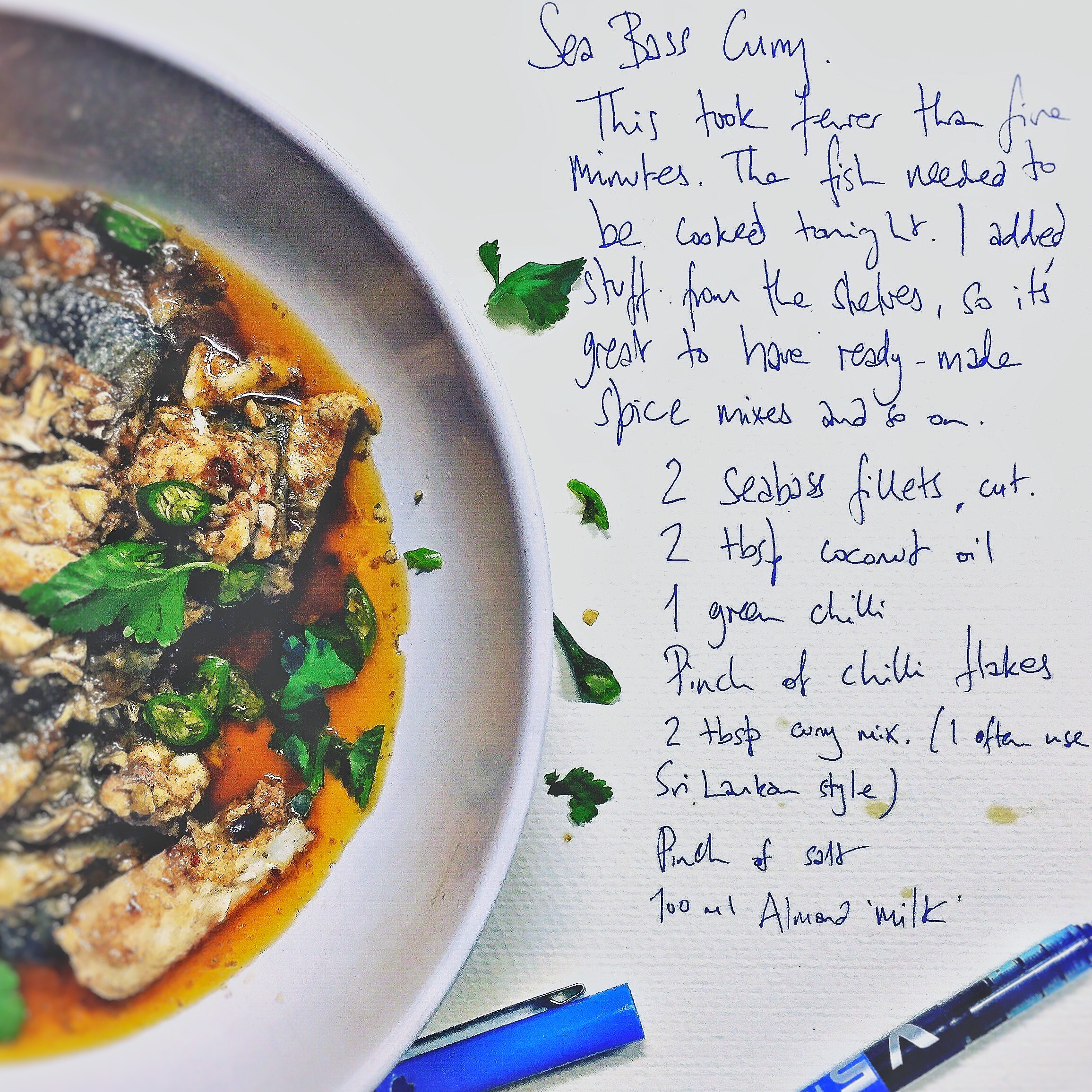 Fry the curry spices in the coconut oil, add the fish chunks. Cook for a few minutes then add the remaining ingredients and a little coriander. You could use coconut milk rather than almond if you prefer or have it.