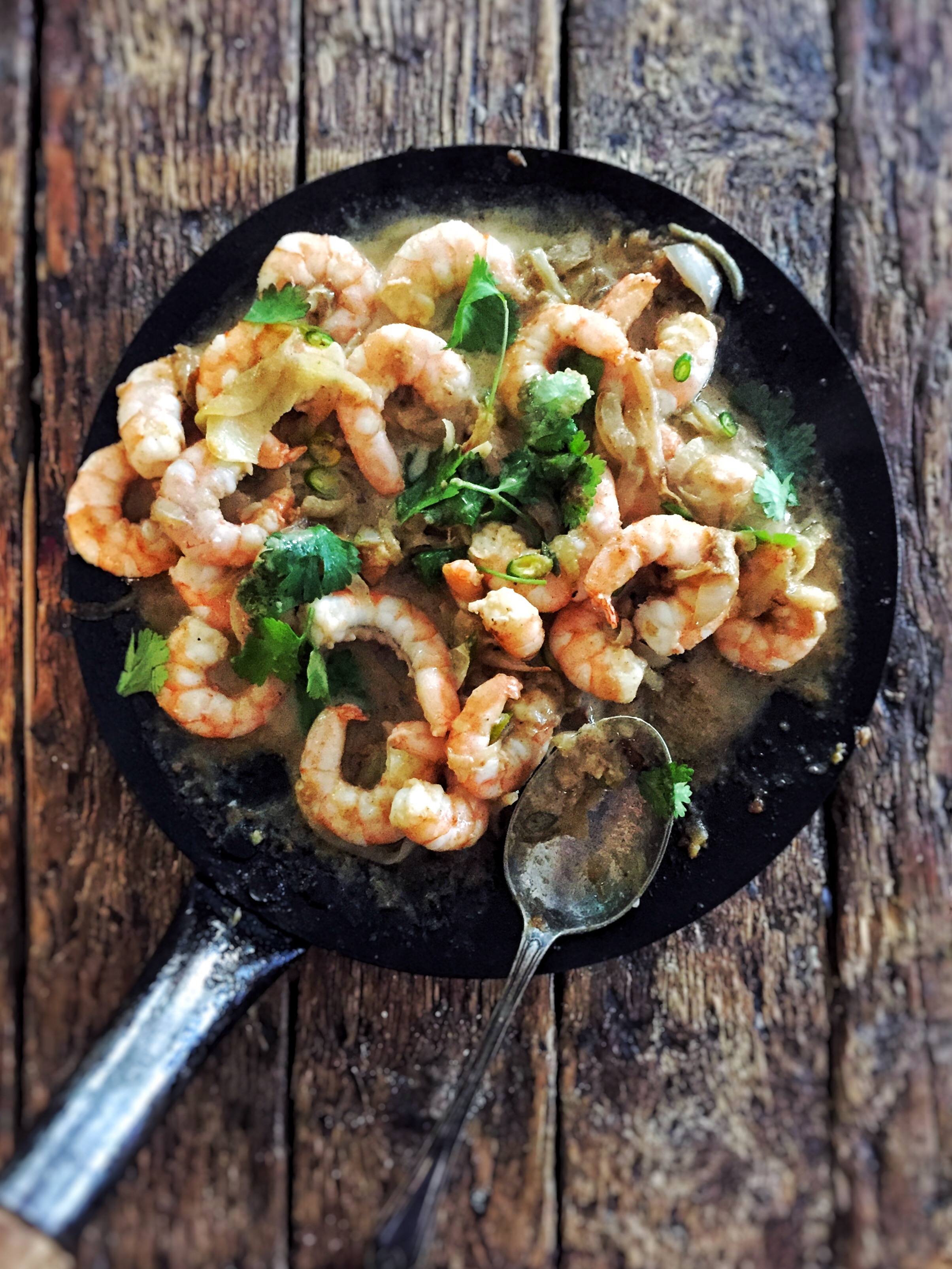Grate in the turmeric and add the prawns. Turn the heat up and cook the prawns for a minute until they start to turn pink. Add the coconut milk, season and stir well. Bring the sauce to the boil and reduce the heat to a simmer for about four minutes.