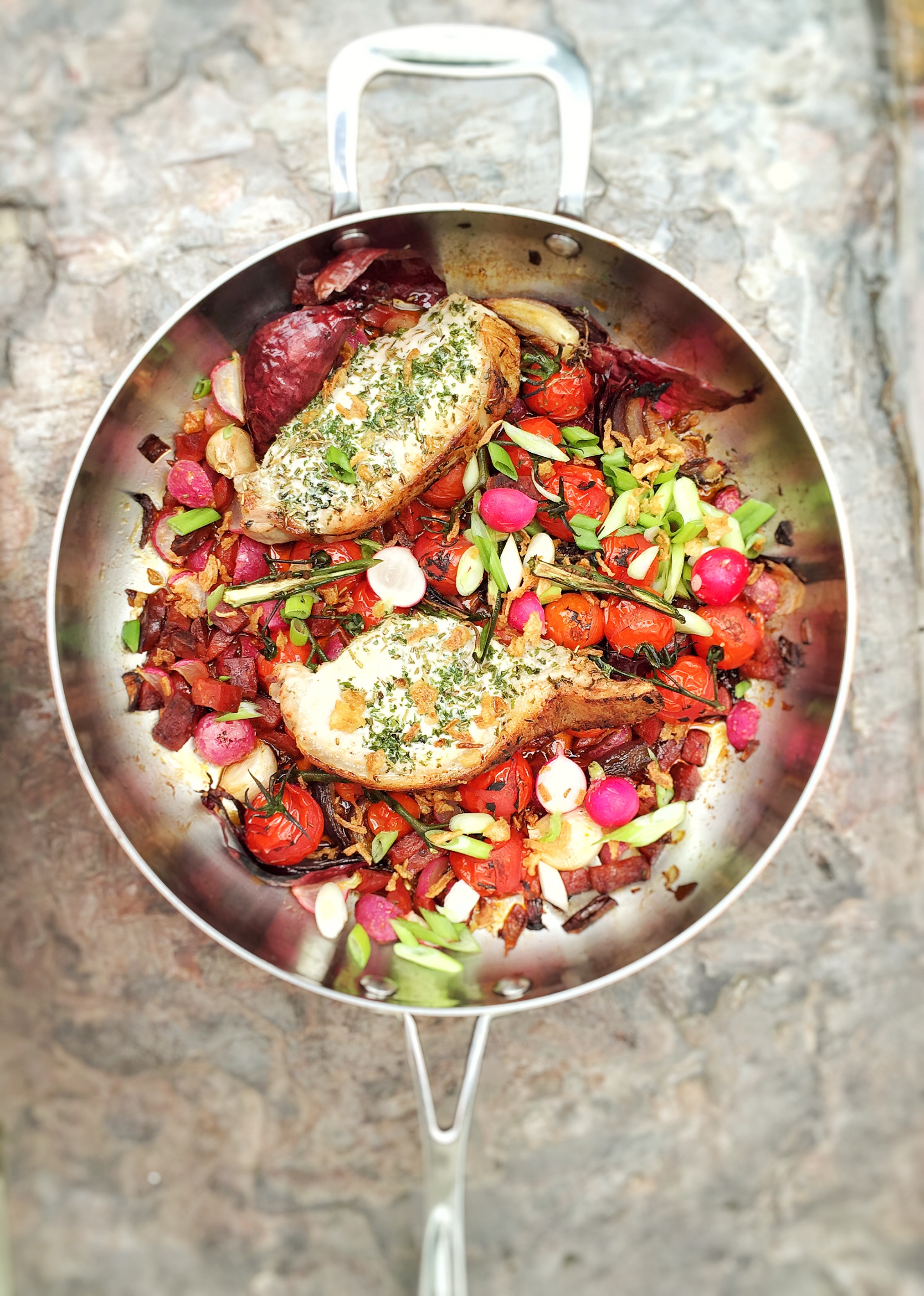 Sweet onions and charred tomatoes with the spicy chilli and chorizo all melting in with the garlic and onion are hearty and satisfying. Here’s a twenty minute meal, then, that has saved pork from the chop.