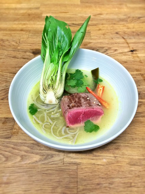 Cook for a minute then put the cooked noodles, bok choi and steak in a bowl and pour over the broth and serve with coriander.
