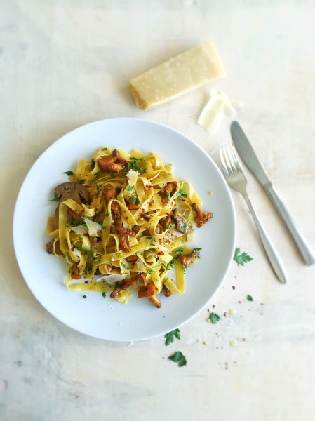 Cook the pasta until al dente, drain and pour through a good glug of olive oil. Stir the chilli flakes and parsley into the mushrooms, check and adjust the seasoning and stir through the pasta. Serve immediately with a drizzle more of olive oil and a good helping of grated Parmesan.