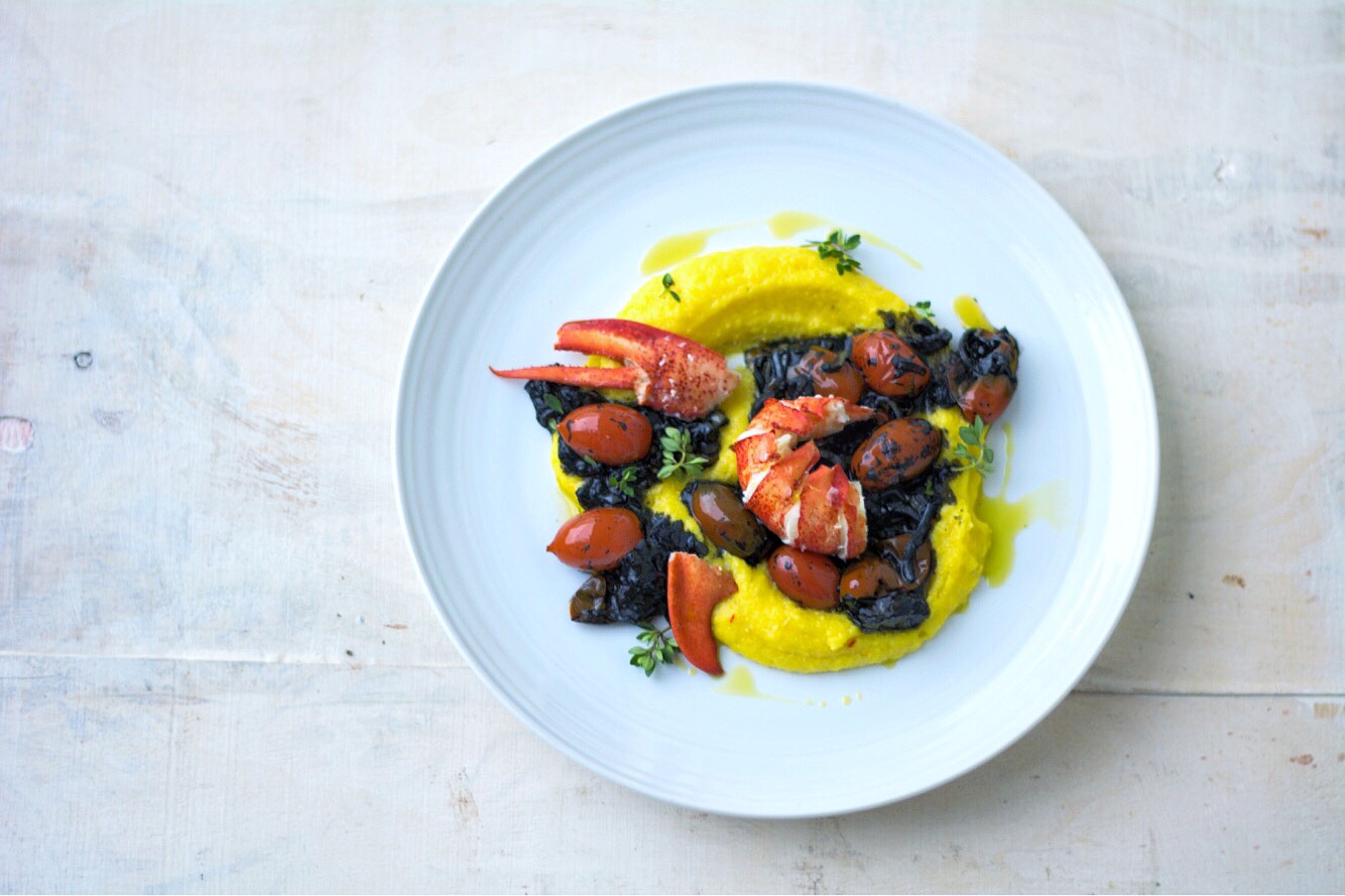 Polenta, lobster and squid ink tomatoes