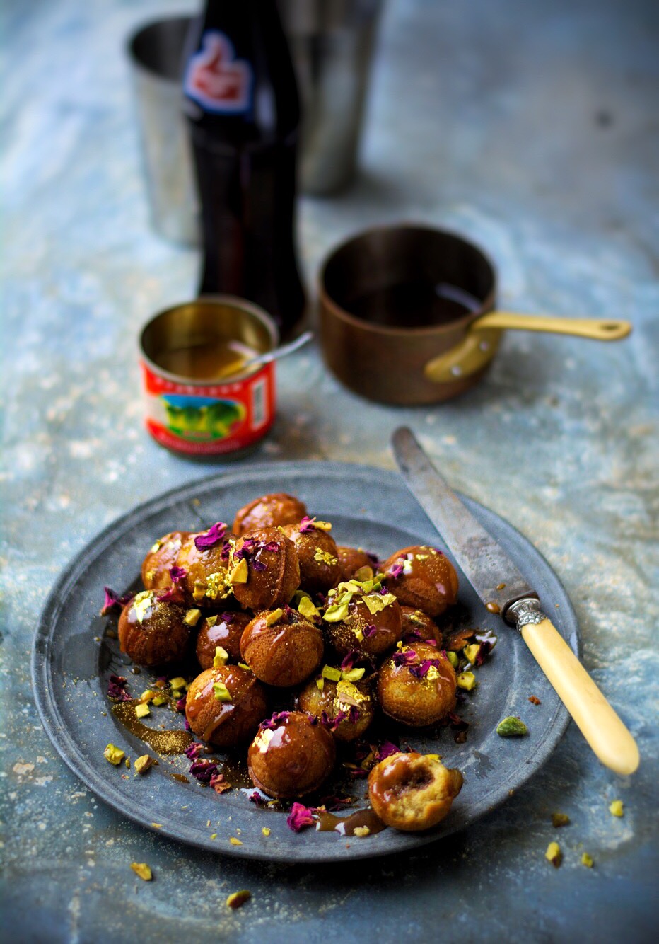 Pile the cake balls onto a plate, pour over the syrup and caramel sauce then sprinkle over the nuts, petals and gold. Serve slightly warm with coffee, or Thums Up! coke if you want a real rush, uncontrollable children and no teeth left.