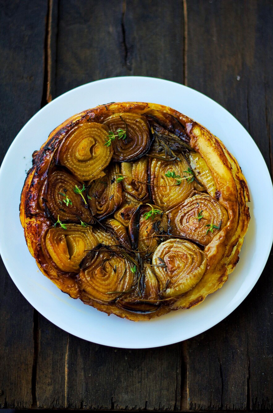 You can cook the onions with the sunday roast if you like, they will keep for a day, or you can slowly cook them in butter in a large sauté pan. I layed mine in a roasting dish, drizzled them with oil and butter a dash of balsamic and a few sprigs of thyme and rosemary, poured in a little veal stock and roasted them for about an hour and a half in the oven until soft, melting, rich and golden. Then all that remained was to put them in a pie dish, lay the pastry over the top, tucking them in tightly and putting them back in for half an hour or so, until the pastry was crisp and flaky. Cooled and turned out it sits on the side waiting to be served with a green salad and sharp dressing.