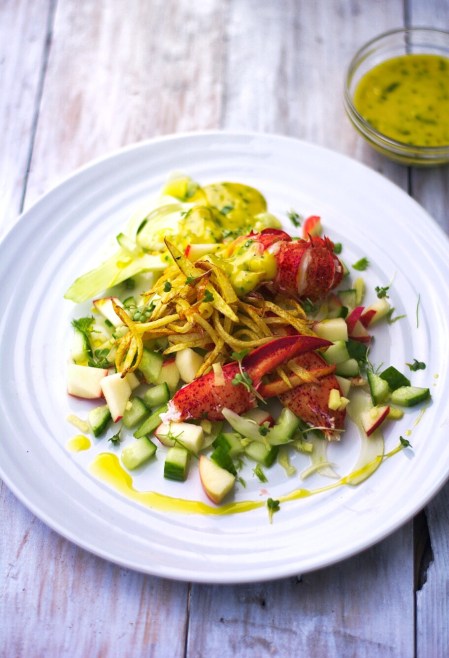 The sweet lobster tail, the delicate claws. The quick pickled apple salad, sharp and crunchy with the aniseed hit of fennel. The warmth and freshness of ginger and the cooling cucumber, mixing among the crisp potato (let’s call them chips, for that’s what they are) and the punchy garlic aioli dressing that will breathe fear into your neighbours. This is a lunch worthy of any table from the city to the huts in Cadgwith or white sandy beaches in Sri Lanka. And all from the freezer and the fruit bowl.