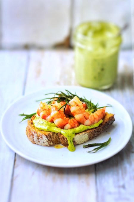 I shelled the prawns over the toast and mayo, squeezing the heads as I did so to get more of the juices out, giving it an even bigger punch of flavour.