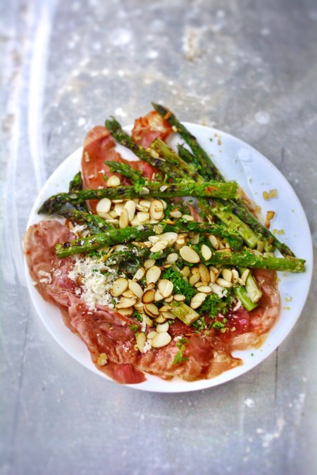 The asparagus, first blanched then grilled on a skillet, dressed with lemon juice, parsley, good olive oil and toasted almond flakes was tossed through the pasta with shards of Parma ham, cooked until crisp and then shattered. A handful of Parmesan cheese grated over, a twist of pepper, a pinch more of Maldon salt and another drizzle of oil and we eat. As shattered as the ham.
