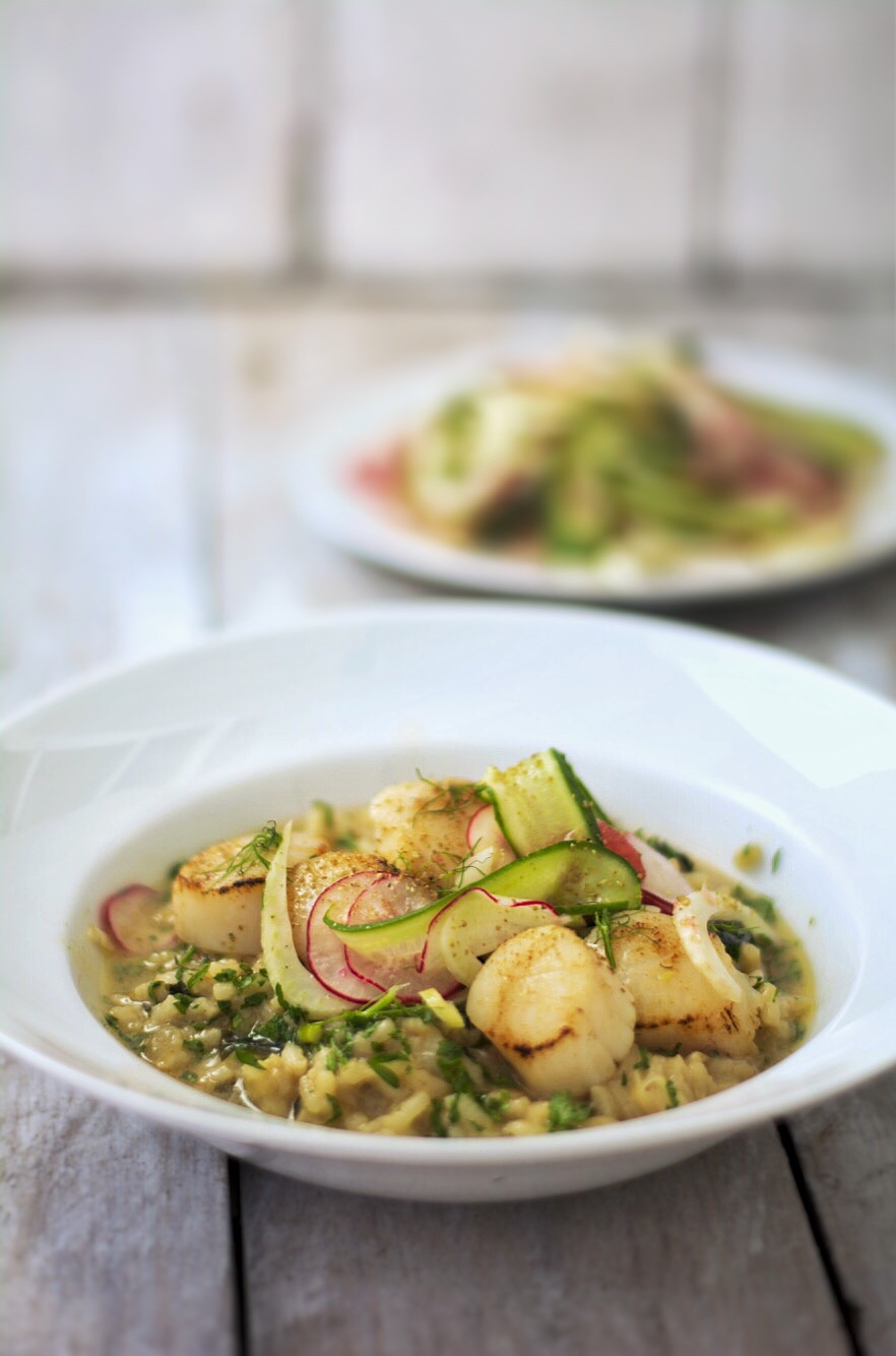 Divide the risotto between four bowls, top with the scallops and some of the fennel salad and fronds, pour over some of the pickling dressing and serve immediately with the remaining salad on the side.