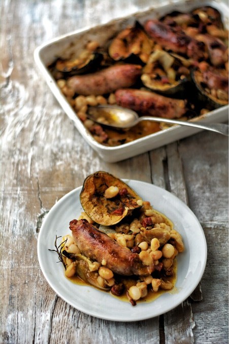 Midweek, Bee and I ate more chicken, this time with asparagus grilled in Parma ham (I see a theme here) and cooked with mirepoix, haricots, pearl barley, thyme, stock and lemon zest and juice. It was hearty and slightly celebratory feeling for a Wednesday. And on Saturday lunch we had today’s recipe: sausages, firm gem squash like hand grenades, cooked to melting softness, chorizo cubes and more haricots. A one pot meal perfect to help you against the cold crisp days now the clocks have gone back and it’s dark just after breakfast. All Autumnal and very, very cosy.