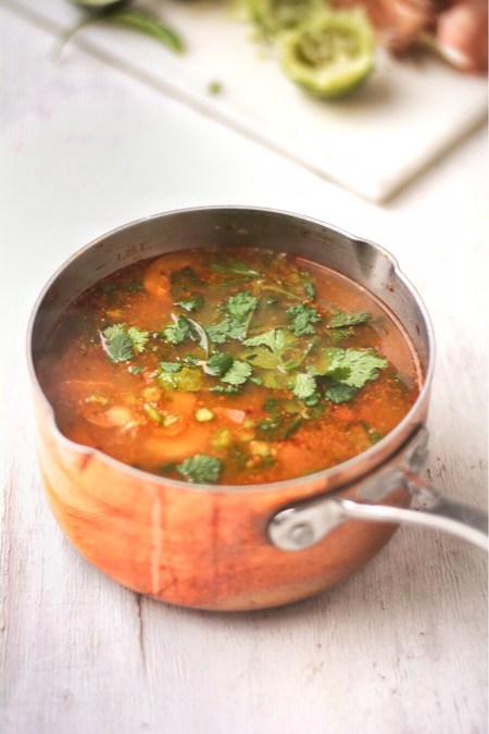 But I’ve never made a proper tom yum, always making it up as I go along. Ben, the chef at Hot Pot (who is from Thailand), gave me this, his recipe, and watched over me as I made it. “Good” was all he said. So I’ll take it that this is the way to do it. I like it fiery, almost lip-numbing, so I’ve gone quite far with the chilli here. Tone it down if you prefer.