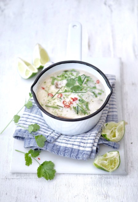 Cook for about five minutes then add the mushrooms and prawns and bring to just below the boil. Cook for another 5-10 minutes, until the prawns are cooked through then season with the lime juice and fish sauce to taste. Try to get the balance between salty, sour, sweet and sharp.