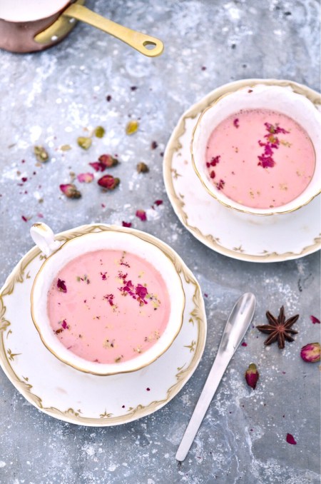 Heat as much milk as you need to fill each cup 3/4 full, pour in the prepared tea until you have a vivid pink then serve hot with a sprinkle of nuts and flowers.