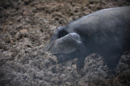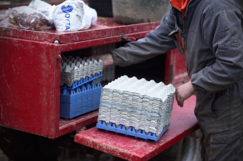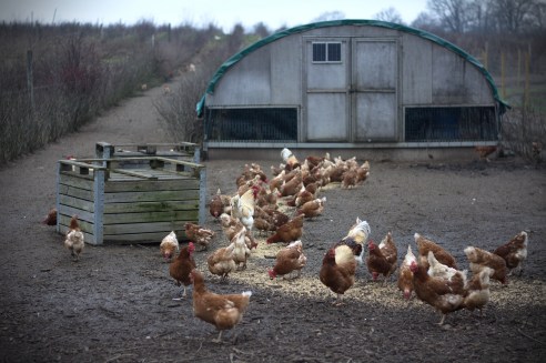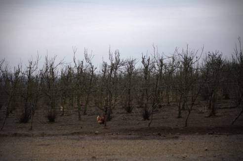 Chickens, lots of them, run freely and curiously among the slim tree trunks, the grass growing happily under their feet. “You don’t see this very often,” says Ellie, picking up her daughter, who was starting to get cold and a little hungry, as was I. She tells me the chickens are owned by a neighbouring farmer and share, and therefore fertilise, the land. We walk along to their coop, a long, movable shed where in the porch-like entrance is a window through which a conveyor belt’s end pokes through. One egg sits proudly on it.