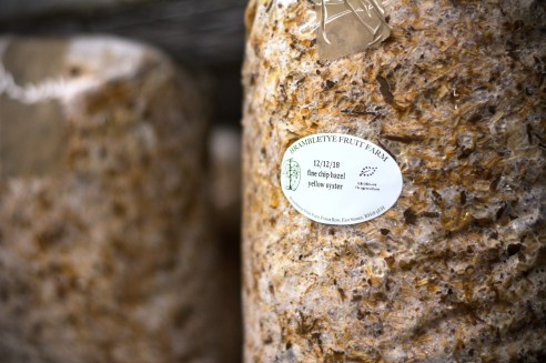 The first thing Ellie took me to see were the mushrooms, growing in an old shipping container. Rows of plastic barrel-like sacks, packed tightly with mushroom spores and wood chippings from the hazel trees in the neighbouring woods were sat neatly on shelves. The damp air and low hum of the artificial lights casting a Bladerunner like glow gave the impression of a strange tunnel, lined with embryonic alien life. Here and there, out of the plastic where holes had appeared, sprouted little mushrooms. Pink, yellow, and blue winter oyster mushrooms were vivid in the half-light, slowly growing larger until harvesting. Growing this way recreates the exact conditions all year round as if they were growing in the forest. This was very different to the mushroom farm’s long stacked beds I spent weekend mornings picking in as a teenager to earn money to buy the latest A-ha album.