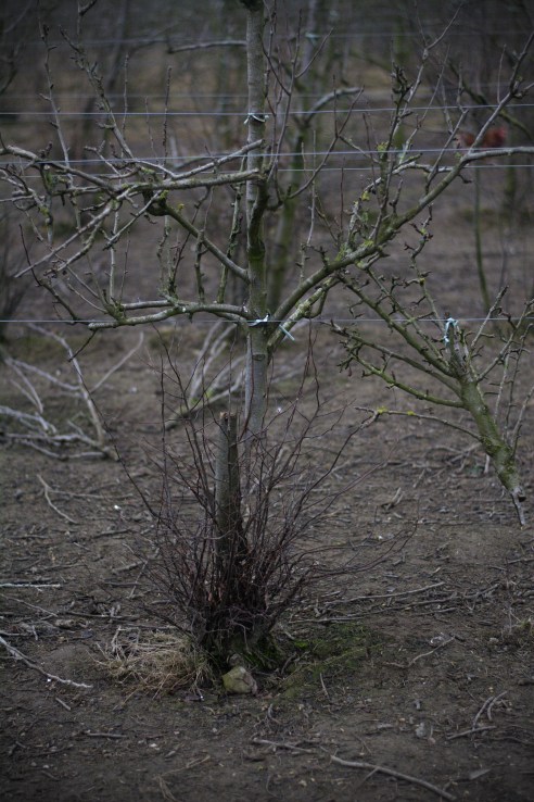 A few minutes walk from the mushrooms and we were on the crest of a hill, the highest point of the farm overlooking the sweeping High Weald. Rows of stunted apple trees, Evita, Santana and Red Topaz varieties, lined the field, sounding like a musical revue. Leafless and jagged, it seemed as if a fierce wind had blown through, stripping everything. On this exposed hillside, it probably had.